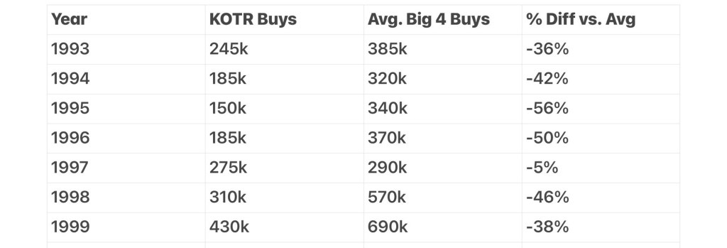 This shows the number of PPV buys by year, the average number of buys at the Big Four PPVs (Royal Rumble, Wrestlemania, Summerslam, and Survivor Series), and the percentage difference between that year’s KOTR and the average of the Big Four. I compared the Big Four because while KOTR didn’t start as early, it was only five years behind when that started, and it ran for a decade straight.