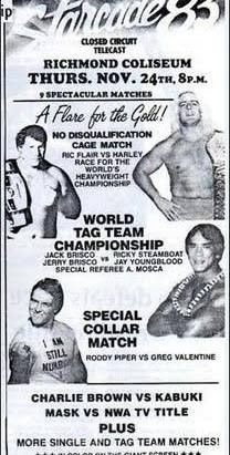 The event was built around the “A Flair for the Gold” campaign, centering on Ric Flair’s quest to reclaim the NWA World Heavyweight Championship from Harley Race. Earlier in the year, Race had placed a $25,000 bounty on Flair’s head, leading Bob Orton Jr. and Dick Slater to attack Flair with a spike piledriver, nearly ending his career. We also had Roddy Piper avenging his injured ear against Greg Valentine in a non-title dog collar match, Rick Steamboat & Jay Youngblood challenging The Briscos for the tag titles in a match where the challengers would break up if they lost, and Charlie Brown (Jimmy Valiant) having to unmask if he couldn’t beat Great Kabuki. The promotion’s top talent had huge matches on this show with high stakes.